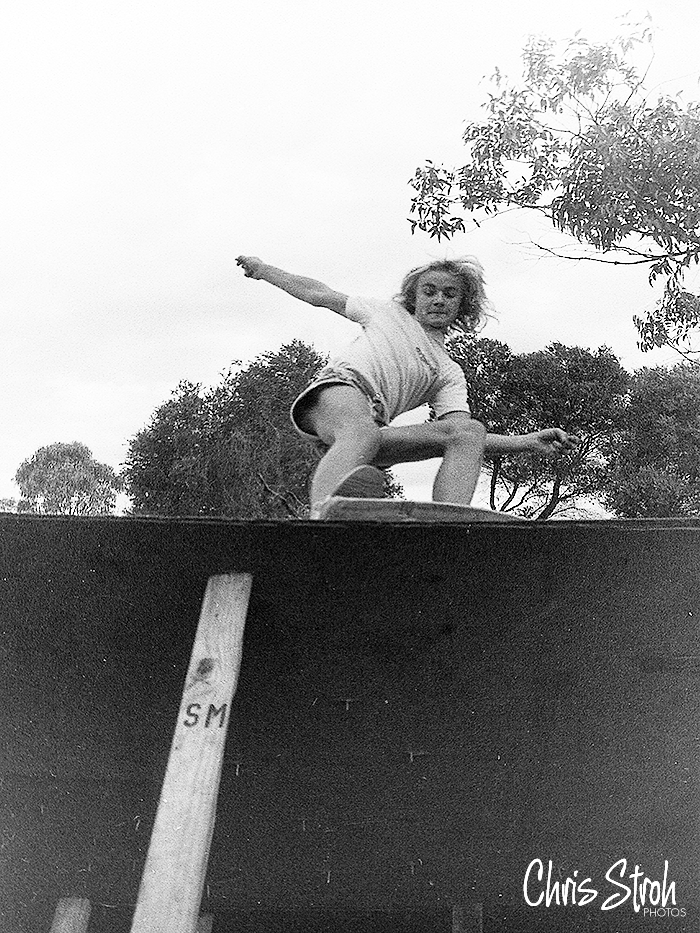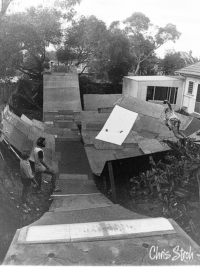 Situated at San Souci in the late 70’s, Tony had his backyard transformed into a wooden Skatepark with scraps collected from cleanups. Rolling was up in a tree and there was a bowl. Gary and Dean Hughes used to shape boards underneath the ramp as well.