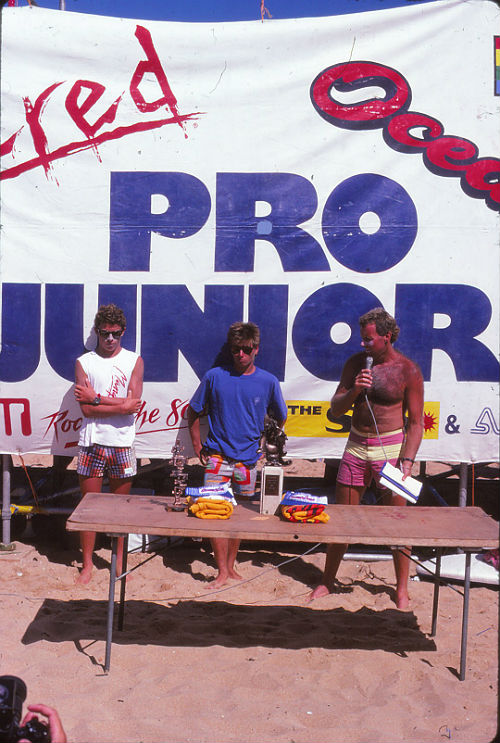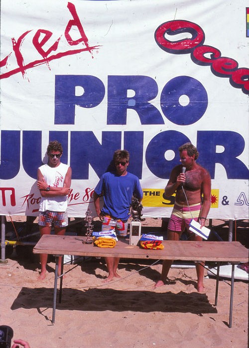 The most hotly tested junior comp in the world, if you won this event it was a stepping stone to a Pro career. Damian Hardman and Mark Sainsbury sweat the results read by Doug Warbick. Mid 80’s.