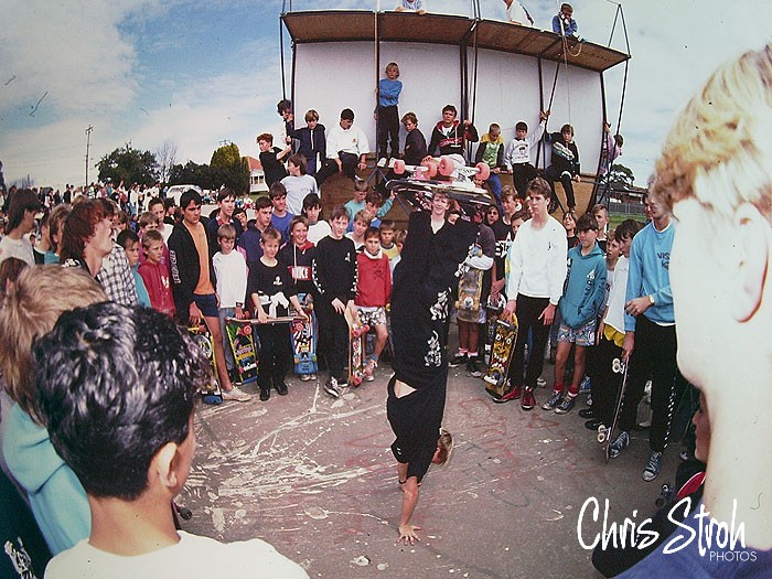 In the 80’s skate comps would have this freestyle skate just like breakdances where everyone gathers around and the guy in the centre lays down his best moves, this day Rudolph handstands for the crowd at Peakhurst.