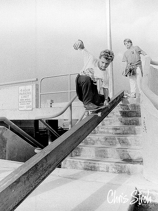 Jake grew up skating the streets at North Cronulla and surfing The Alley now one of the worlds most recognized skaters. This shot, girder slide taken at Cronulla carpark around ’87.