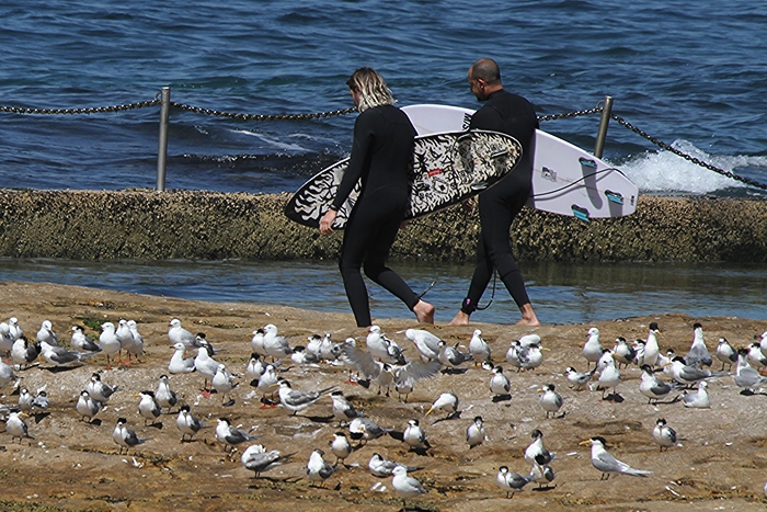 Jack Irvine and buisness partner in Space 44, Aaron Girgis head for some pre summer swells at Cronulla.
