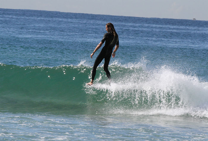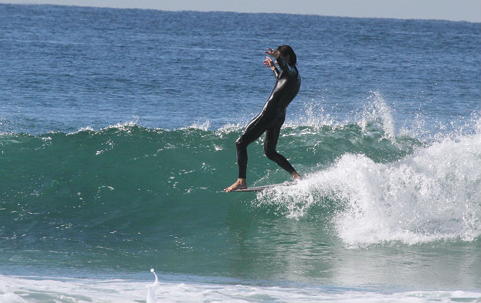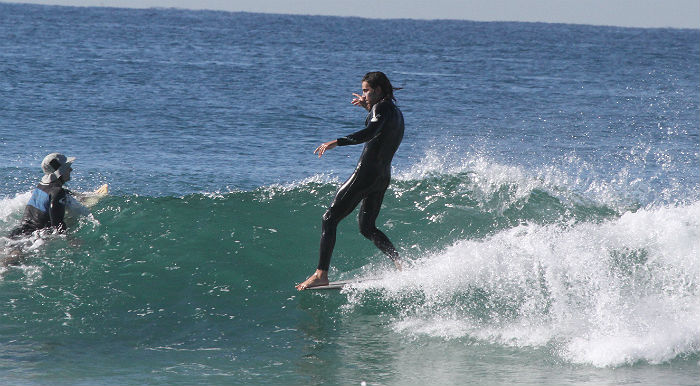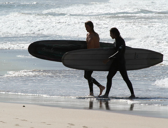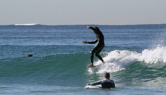 Tyler Barnes and Matt Sorenson trading waves on a railing right hander beachy.