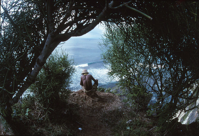 Local Balo eyes the swell from the cliffs above.