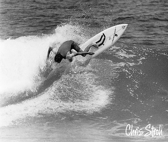 In the 70’s Derek wrote a regular column in SW magazine called Hyndsight. In a cruel matter of fate he was robbed of the sight of one eye after he was stabbed by his own board, didnt stop him ripping though. Narrabeen late 80’s.