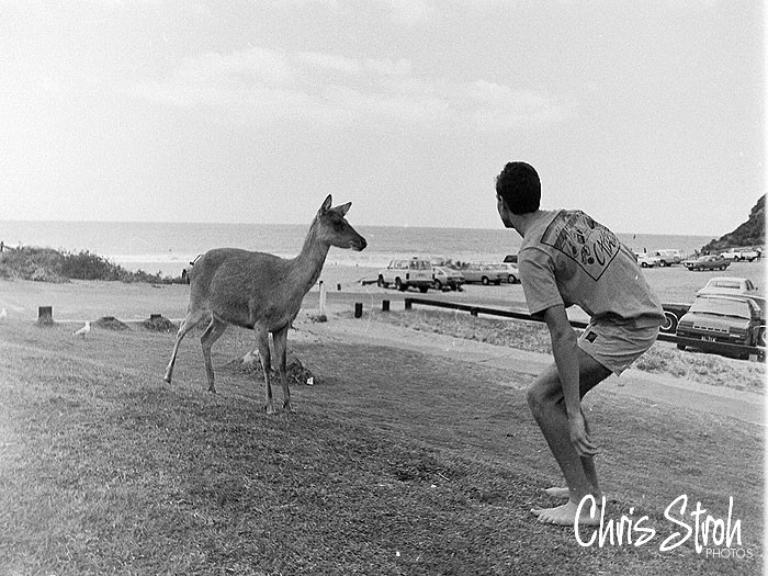 GarieĀ is part of The Royal National Park so its not surprising to see all kinds of natural wildlife walking around the beach. Here Ash Gee tempts a deer with a offering.