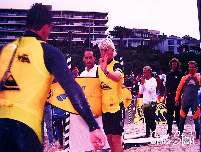 Surf Leaque at Bronte and Newport Plus riders Martin Potter tags Jack Hagen while brothers Nick and Tom Carroll look on.