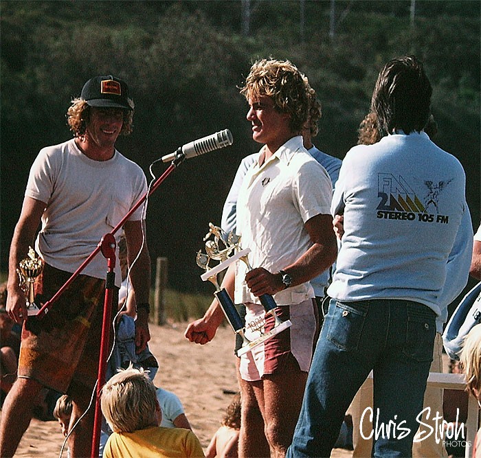In 81 the prestigious NSW Open Title was held at Newport Beach. First place went to Glen Winton receiving his trophy and 2nd to Nick Carroll looking on in hat.