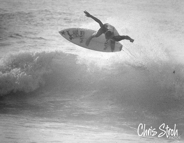 Robbie Page from Wollongong was one of the sports truelly funny characters on land but once in the ocean he was all business. This pic captured him popping the fins during a pre-warm up session at Narrabeen at a Pro Junior comp early 80’s. The former Pipe champion and star of Northshore went underground after his bust in Japan and disappeared from pro surfing.