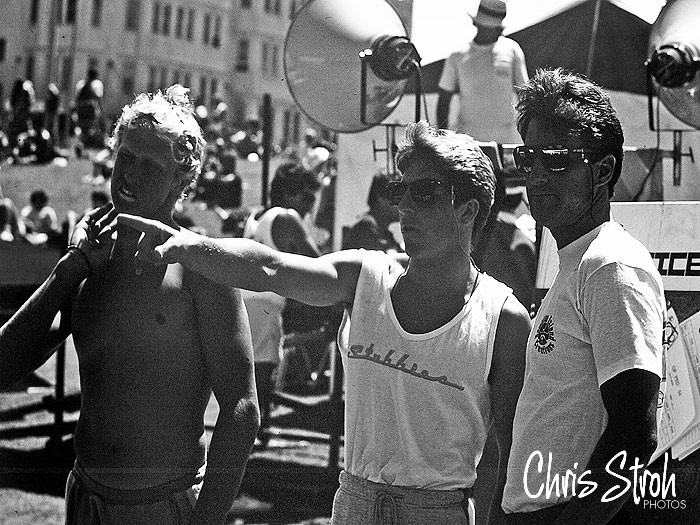 Robbie Page (Aus), Mike Lambresi (US) and Hans Hedemann(Haw) discuss tactics during a pro comp at Bondi around ’86.
