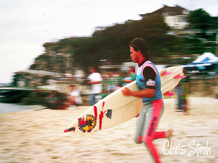 Kerbox was the life of the party, hailing from the Bronte area he was part of the In The Nude board riders club in the 80’s, seen here competing on home sand.