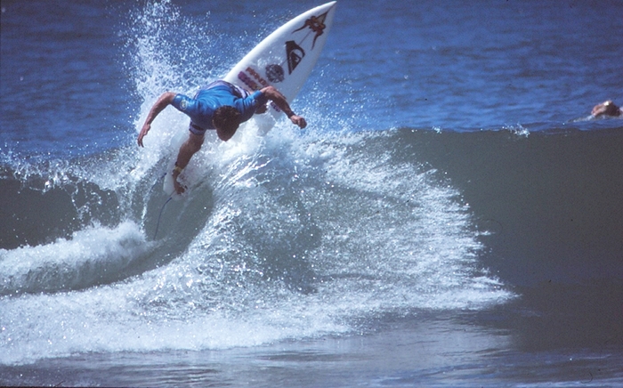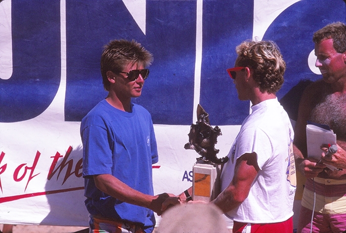 Mark Sainsbury from Avoca was a top competitive surfer throughout the 80s and is credited with inventing the floater move. Below Sanga with Tom Caroll after winning the Pro Junior at Narrabeen.
