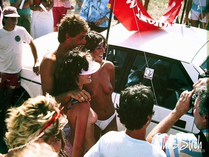 Surfing’s ultimate playboy back in the day Shaun Tomson inspects the local girls of Bondi at the OP Pro.