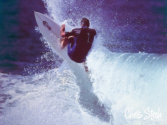 Most shots you see of Simon Anderson he is going left at Narra. This day he snavelled a right and showed his wave demolishing forehand power thanks partly to his revolutionary Thruster equipment. Circa 80’s.