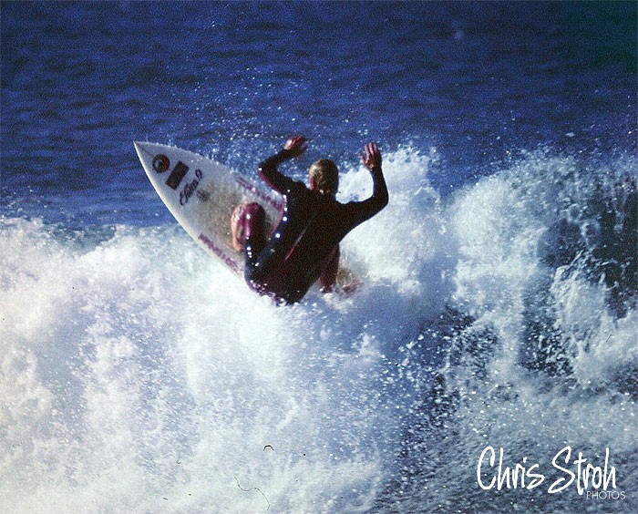Stuart D’arcy was a Cronulla born and bred surfer. This pic caught him mid flight out at Cronulla Point. Stuart was a famous model back in the day and even had the honour of being the Milky Bar Kid. These days he shapes his own custom boards on the Gold Coast . Photo late 80’s.