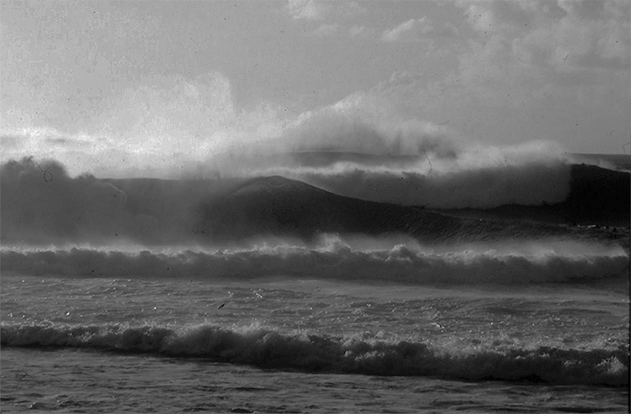 Rising super swell at Pipeline right on sunset, the outer reefs explode with raw ocean power.