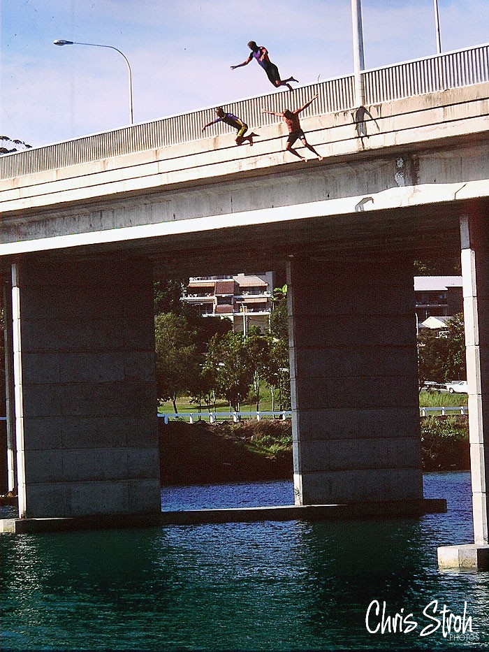 This is Currumbin bridge on The Gold Coast. It was a regular stunt to jump from the bridge until police started fining anyone they caught. Not something I would recomend as Im scared of heights and would not do it.