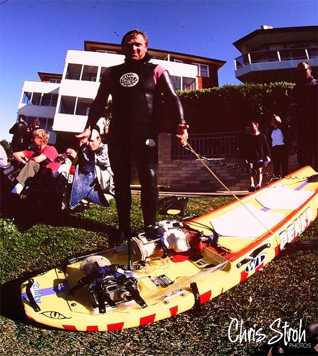 Marty also known as the Cosmic Pigmy was a complex character just like many other surf photographers. I could spend hours telling you Marty tales. However through all his eccentricness he was still a fine photographer. This shot taken at Cronulla Point shows Marty armed to the teeth with his specially made board to shoot from.