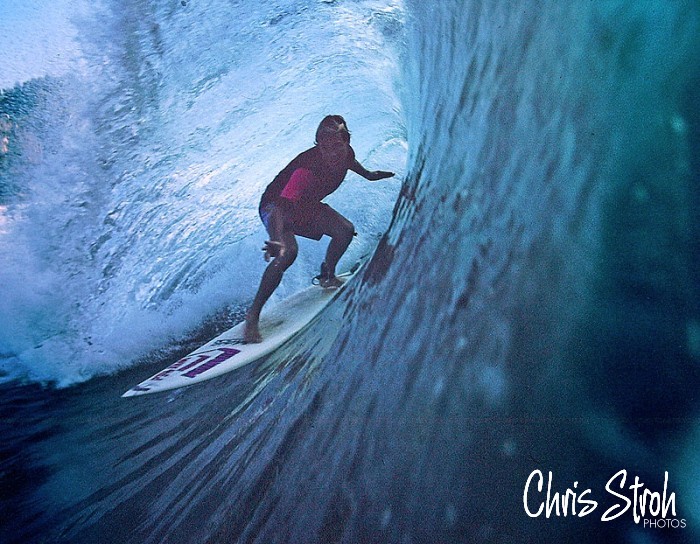 The late Andrew Murphy finds the right line at Ulu’s to get deep and still make it. Murph could ride the tube as good as anyone.