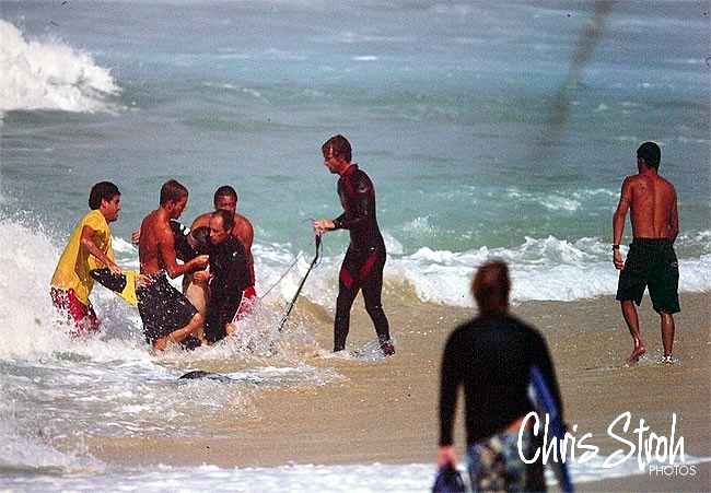This day I was shooting Pipeline when photographer Dean Wilmont came out of the surf. We spoke for a few moments when he spotted a board tomb-stoning in the shallows. He bolted back out and Tommy Carroll and he were the first to reach the victim. The surfer was a young guy from West Oz and he was knocked unconscious and been under water for a very longtime. When they got him to shore he was purple and half the ocean came pouring out of his mouth. We all thought he was a goner. This guy defied the odds and came to after a lot of cpr and lived. He survived unaffected physically except for a cut on his head by his near death experience.