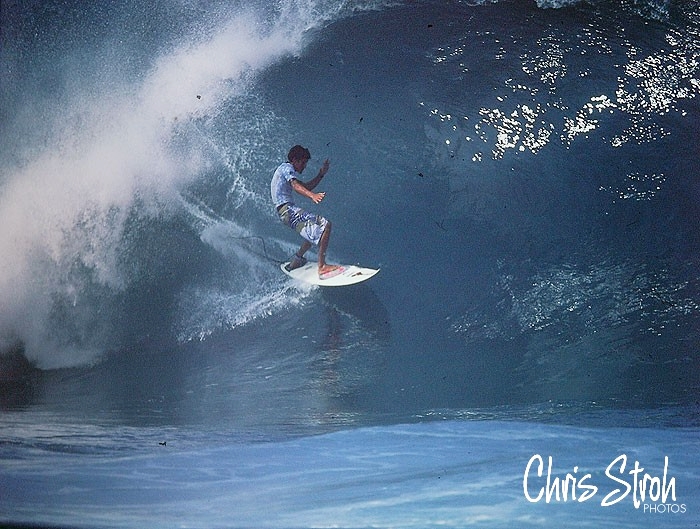 A micro second after I hit the trigger Rob got covered in spit from the Pipe barrel he just came out of. This was the semi final heat in ’95 when he and Slater were doing high fives. Love the Lopez kind of style tribute.