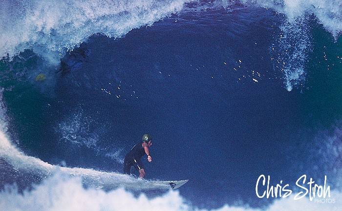 At Pipeline in the mid 80’s TC earned the same kind of respect that Rory Rusell and Gerry Lopez achieved in the 70’s. The only difference being instead of just riding the barrel with style and grace Tommy began snapping turns in the most critical sections where no one else had gone before. This shot of the accident prone TC wearing a Gath helmet was shot mid 90’s as he draws his line at Pipe and is about to get enclosed by the lip.