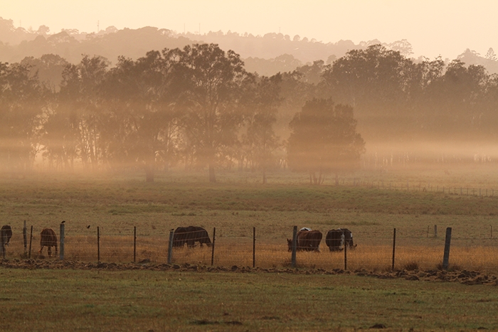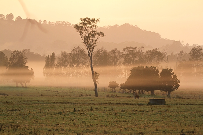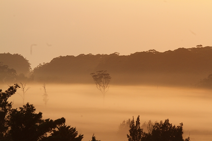 Misty mountains and thick morning fog on sunrise create a natural but dream like landscape on the South Coast.