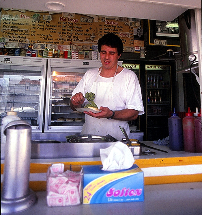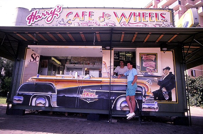 Harry’s Cafe De Wheels at Wooloomoolo in the 80s. Serving up a pies and peas delicacy.