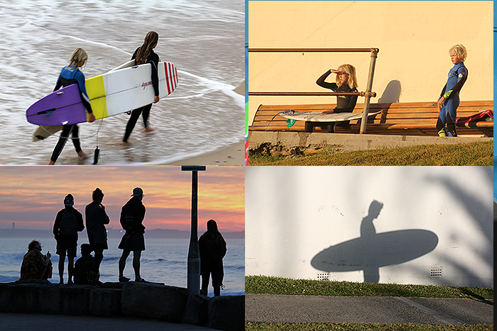 Girls digging it, Groms too, Backpackers and shadow man at Oak Park.