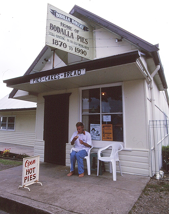 Aussie surf photographer Heydon Bunting tucks into a mystery bag at The Bodalla Pie Shop in Vico on the road to Bells Beach