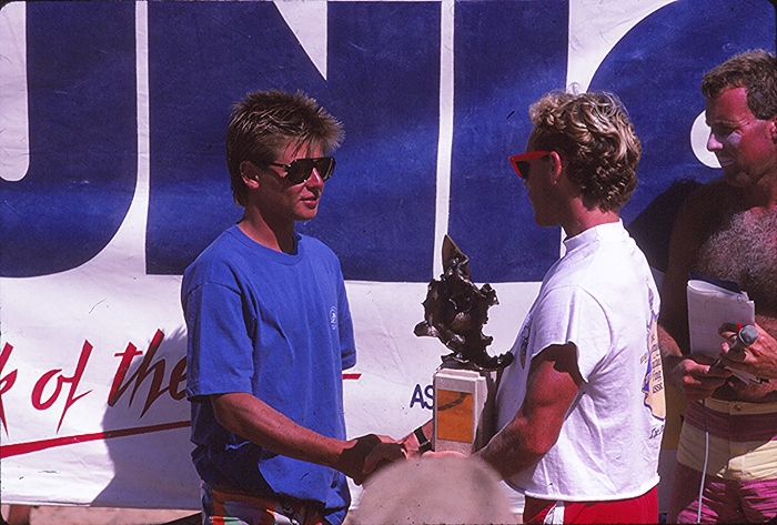 The late Mark “Sanga” Sainsbury is best known for introducing the floater to the Surfing World in the mid 80’s. Below Sanga wins the prestigious Pro Junior at  Narrabeen in ’85 and as is awarded his trophy by Tom Carroll.sanga