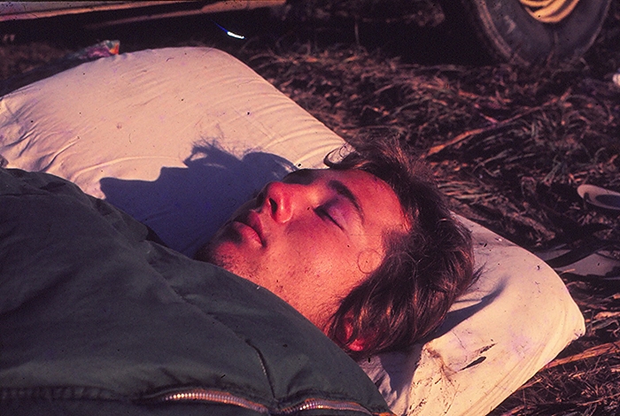 Ron sleeping overnight on the ground next to the car on a Ulladulla no frills 70s surf trip. Stylemaster Froggo Tea Tree Bay Noosa sunshine Nat Young the Animal Panel Van Wanda carpark