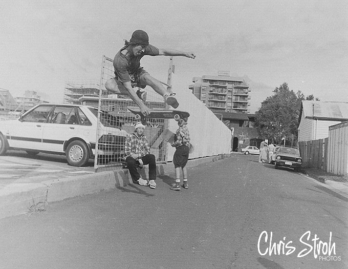 Evo was a well known around the streets of Cronulla in the 80’s. From his skills on a surf board to his Sk8 talent he attacked life at full speed. Evo launches at the Construction site in the back streets of the Nulla while Dan White and young Jake Brown a future superstar of the sport watches on.