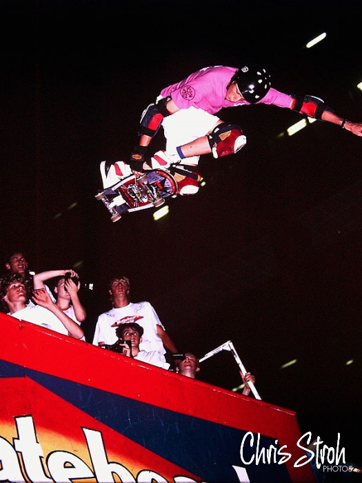 The Bones Brigade put on a demo in the middle of the city around ’87. Mike Magill, Steve Caballero, Tony Hawk and Christian Hoisoi thrilled a shoulder to shoulder crowd. This move by Tony Hawk had the skate kids frothing. Loose boards caused havoc and several spectators in the crowd were hospitalised.