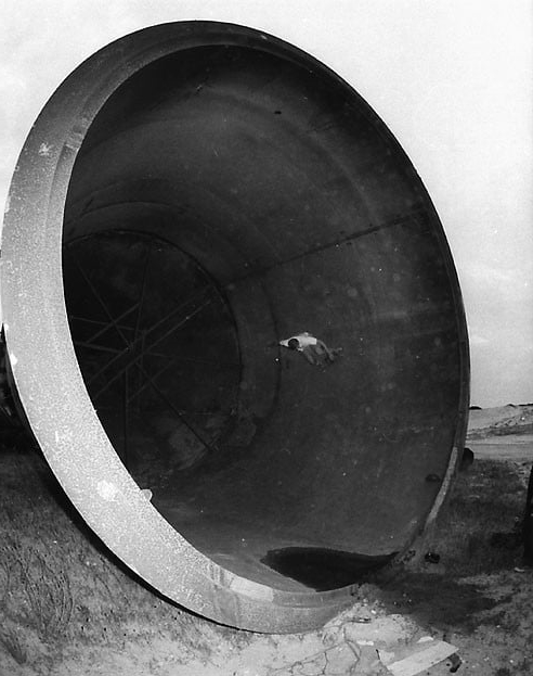 It was hidden away in the sand dunes at Wanda. The skaters found it and had to do hit and run missions as the workers would run them off. Pete Billinghurst in action in the late 80’s. At the time it was the biggest Pipe ever skated in Oz.