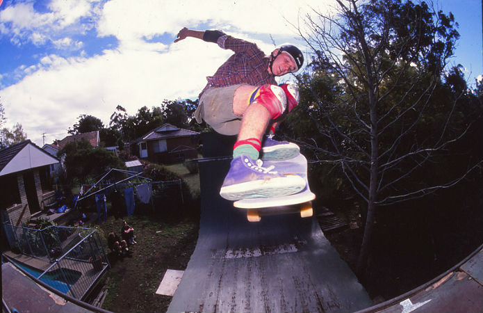 Cronulla local Steve Higham was one of the best Vert skaters in Sydney back in the late 80s,  on Mitch Newell’s backyard halfpipe.